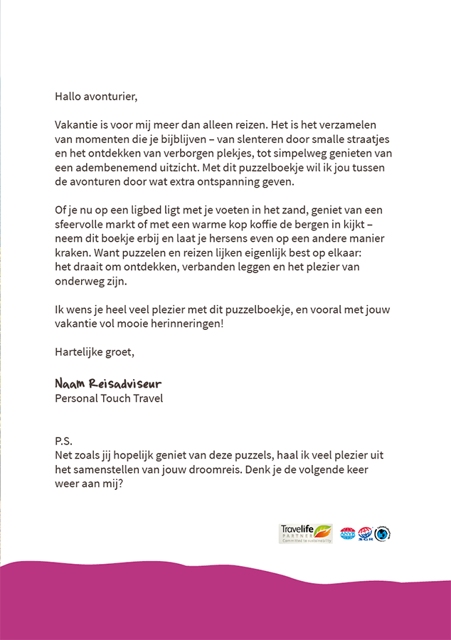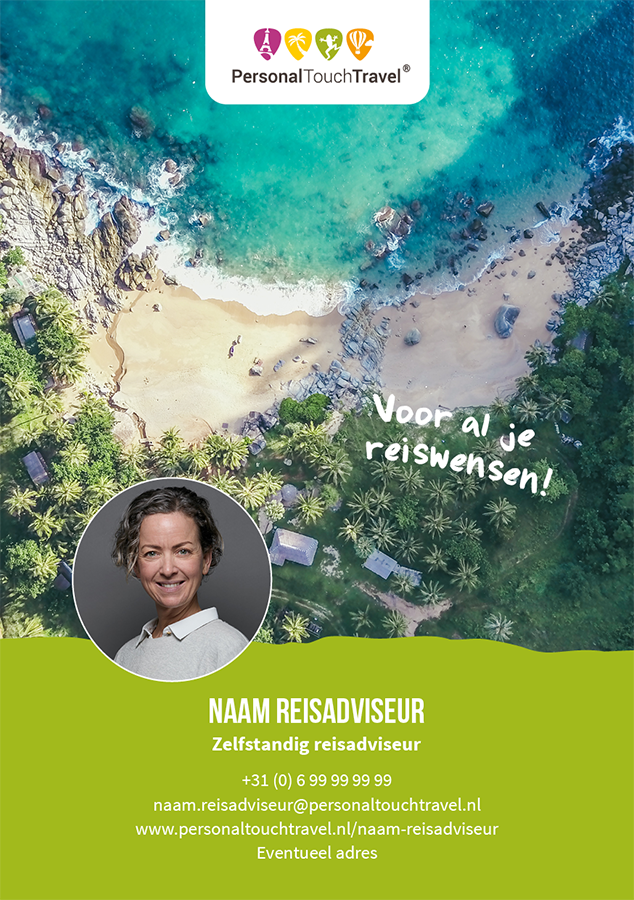 Alternatief: niet gepersonaliseerde variant, maar een algemene variant van Personal Touch Travel. Om 1 grotere hoeveelheid te bestellen en met collega's te delen (deze worden dan op 1 adres geleverd en dienen door jullie zelf te worden verdeeld/verstuurd):